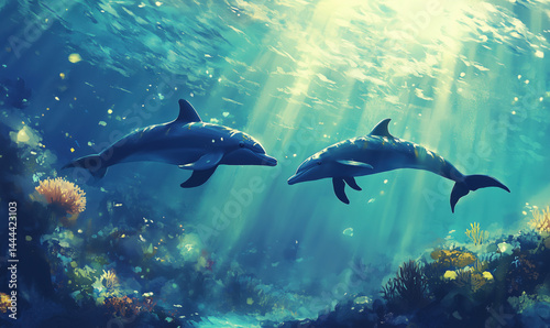 Fototapeta premium Dolphins swimming gracefully in vibrant underwater scene with sunlight rays.