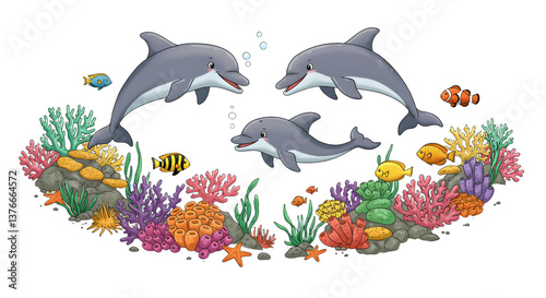 © SRI, Obraz premium Dolphins Swimming in Coral Reef Cartoon Illustration for Children