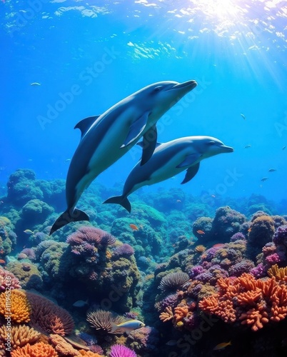 Fototapeta premium dolphins swimming in the ocean with corals and other fish