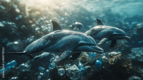 Fototapeta premium Dolphins swimming through plastic bottles and fishing nets, symbolizing human...