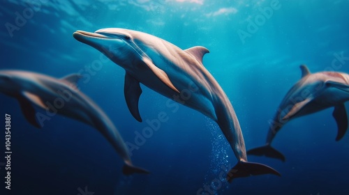 Fototapeta premium Dolphins Swimming Underwater Ocean Wildlife Marine Animals Blue Water...