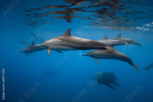 Obraz premium Dolphins swims underwater in blue sea. Dolphins pod in Indian ocean