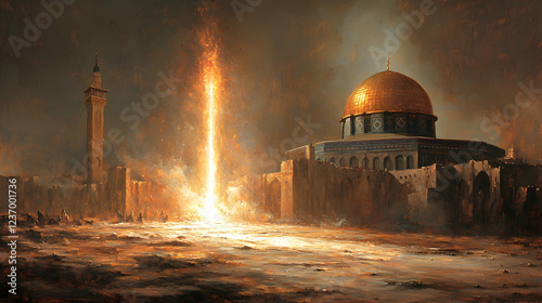 Naklejka premium Dome of the Rock fiery destruction apocalyptic scene, Jerusalem