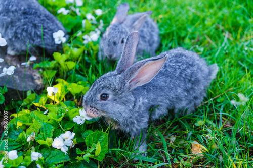 © Ganna Zelinska, Fototapeta premium Domestic animals. Small gray rabbits of dewy morning on green grass. Close up.