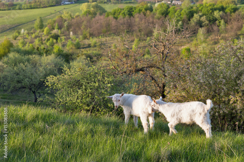 Obraz premium Domestic baby goatees in a pasture spring orchard closeup