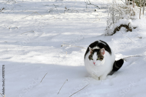 © JRJfin, Fototapeta premium Domestic cat in the snow. Space for text.
