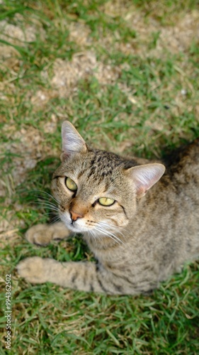 © Tonya, Fototapeta premium Domestic cat lies on green grass basking in the sun. Cat in nature, green cat with green eyes