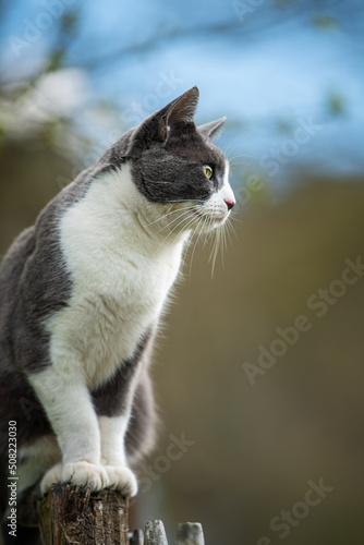 © DoraZett, Fototapeta premium Domestic cat on a garden fence