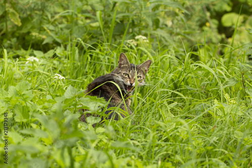 Fototapeta premium Domestic cat on a meadow. Cat catches a mouse. Tabby cat. Looking for a cat in a lens
