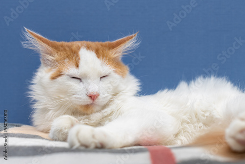 © Oleg Opryshko, Fototapeta premium domestic cat resting lying on a blanket