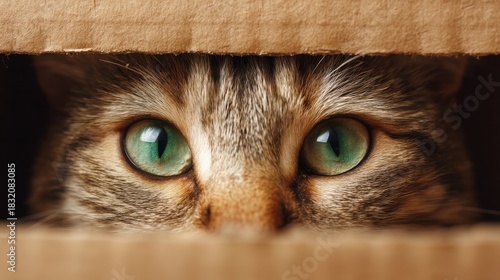 © backup_studio, Naklejka premium Domestic cat with striking green eyes peeking from inside a cardboard box. Curiosity and playful hiding behavior of a pet animal.