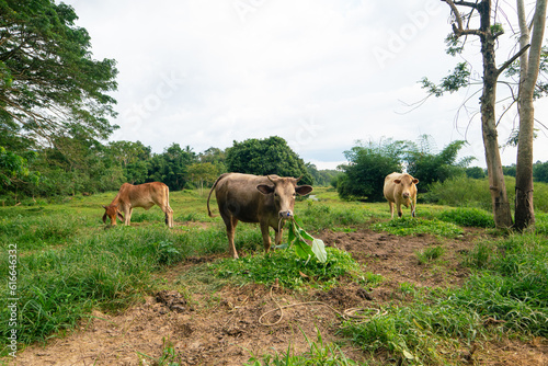 Obraz premium Domestic cattle cow eat grass in outdoor farm forest