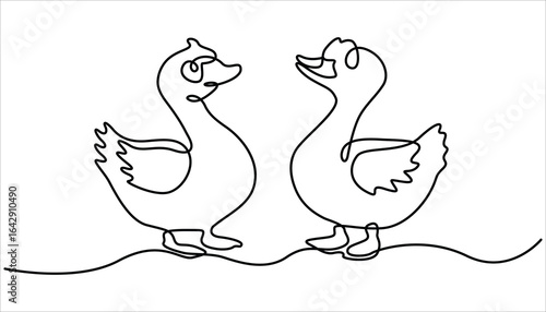 © Creative Tania, Fototapeta premium Domestic goose continuous one line drawing, Duck in continuous line art drawing style. One line Duck and ducklings. Continuous line drawing. Isolated sketch on white background. Vector illustration.