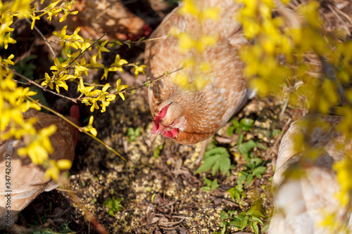 © Lesya, Fototapeta premium Domestic hens graze under a forsythia bush on a home farm in early spring.