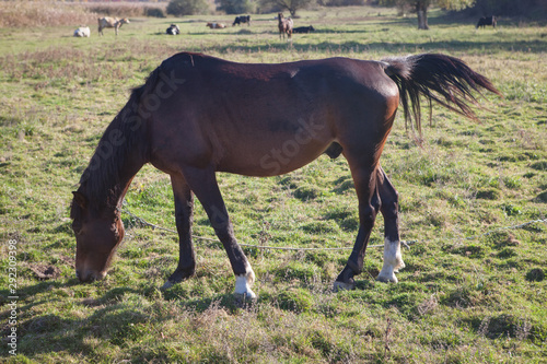 © Leilani, Fototapeta premium domestic mare grazing on the farmland meadow