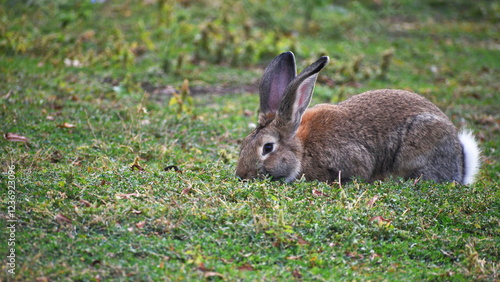 © Lukeriya, Fototapeta premium Domestic rabbit eats grass on the lawn