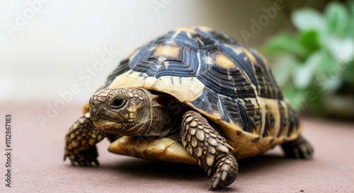 Fototapeta premium Domestic tortoise exploring outdoor garden environment