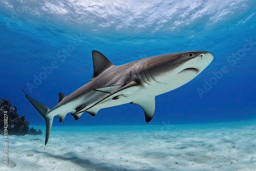 Naklejka premium Dominant Hammerhead Shark Swimming Across Bright White Water