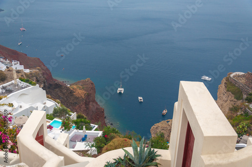 © Gianluca, Fototapeta premium Domy i tarasy wioski Oia nad zatoką z czerwonymi klifami