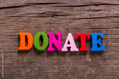 © adragan, Fototapeta premium donate word made from colored wooden letters on an old table. Concept