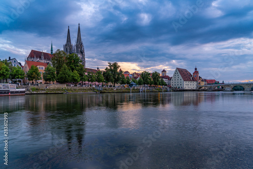 © zauberblicke, Naklejka premium Donau-Ufer und Regensburger Altstadt am Abend