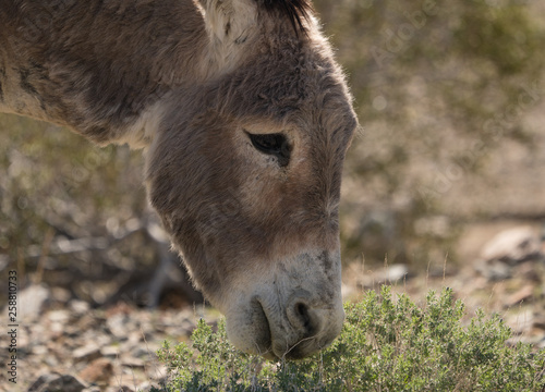 Fototapeta premium Donkey eating desert brush in Mojave.