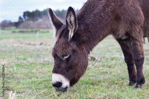 © Berto, Fototapeta premium donkey eating fresh green grass in a farm field. copy for space.