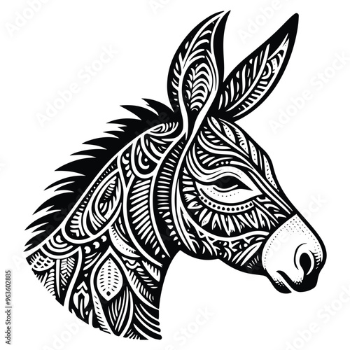 © Cici, Fototapeta premium Donkey in zentangle art, stencil logo, black and white animal illustration
