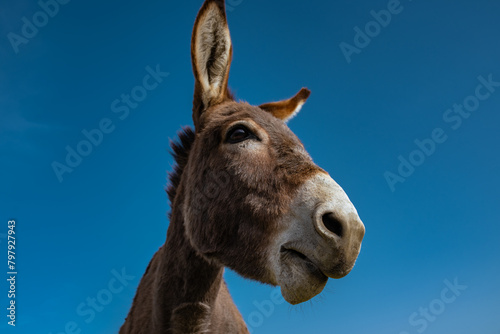 © chaossart, Obraz premium Donkey portrait on blue sky background