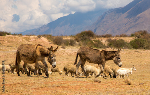© Bob, Fototapeta premium Donkeys and sheep are being moved to a new pasture near Maras, Peru