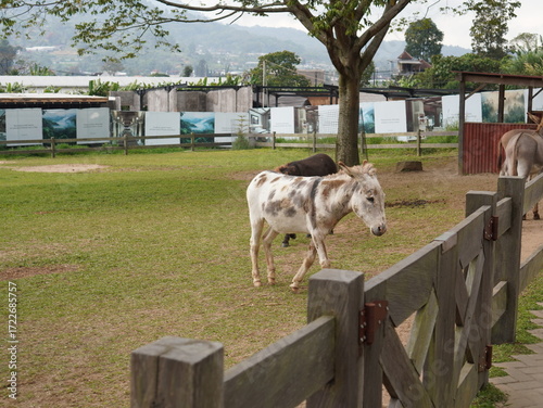 © Yelyzaveta Mahazinh, Obraz premium Donkeys standing behind a wooden fence in a farm paddock, spotted and brown donkey outdoors in rural countryside.