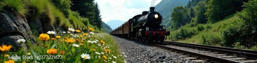 © Sutasinee, Fototapeta premium donna posa lungo la Ferrovia con la sua macchina, acqua, macchina, oggetti