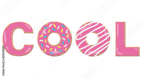 Fototapeta premium Donuts in pink icing and sprinkles in creative text are cool on a white background. Vector image