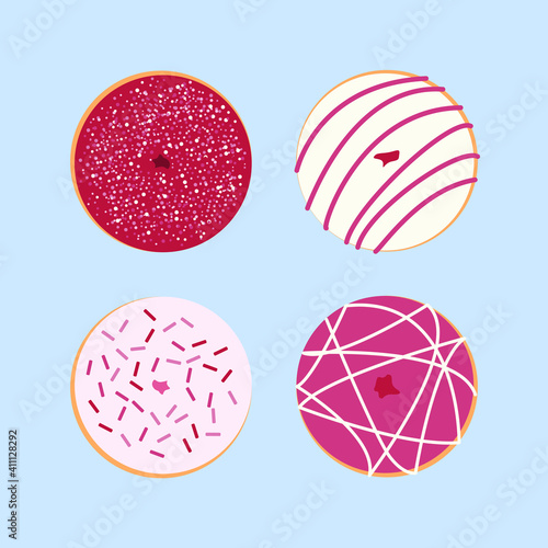 © ariadna art, Fototapeta premium Donuts set of white donut, pink donut and dark pink donuts. Glazed donuts isolated on blue background. Vector stock illustration.