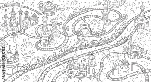 Naklejka premium Doodle art coloring page presenting a vast network of looping and spiraling train tracks connecting various space stations and moons
