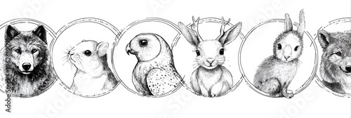 © Anat art, Fototapeta premium Doodle Banner Featuring Black Ink Sketches of Animals Including a Wolf, Bear, Deer, Owl, Fox, Rabbit, Hedgehog, and Squirrel in Doodle Frames