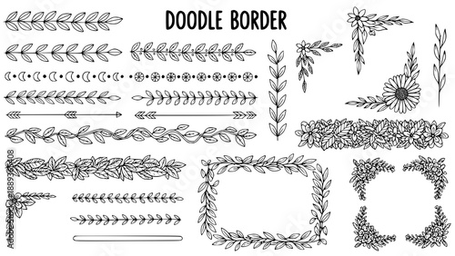 Fototapeta premium Doodle border. Flower ornament frame, decorative corner elements, floral sketch pattern. Vector doodle frame elements. JPEG version.