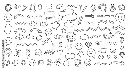 Obraz premium Doodle Collection Hand-Drawn Arrows, Shapes, and Emotion Icons for Creative Design