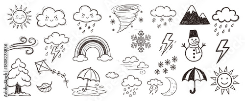 © Aoao, Fototapeta premium Doodle collection of weather icons and climate elements: sun, smiling clouds, rain, snow, thunder, rainbow, snowman, and wind, perfect for educational or forecast design.