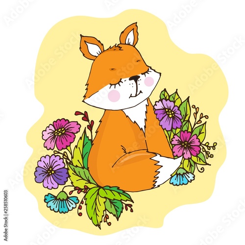 © natka80, Fototapeta premium Doodle cute little Fox in flowers