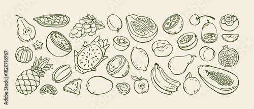 © Paper Trident, Fototapeta premium Doodle exotic fruit. Different tropical food: fresh oranges, lemons, apples and bananas. Organic pineapple, natural berries and grape. Hand drawn isolated vector illustrations on white background