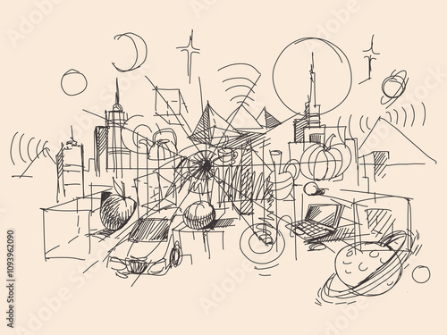 Obraz premium Doodle. Geometric shapes. Objects in perspective. Line sketch
