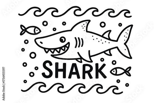 Fototapeta premium Doodle Shark Scene. Doodle shark with waves, fish, and bubbles, center word “Shark” in black and white isolated transparent