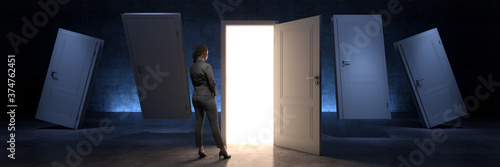 Naklejka premium door and businesswoman, door to new opportunity. 3d rendering