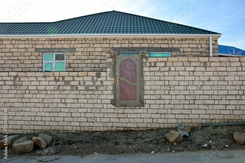 Fototapeta premium Door in unfinished building standing above ground level. A funny looking...