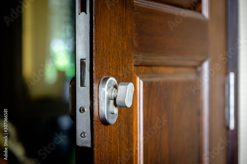 © Phitchaya, Obraz premium Door lock attached to the wooden door