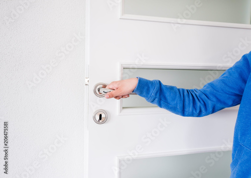 © mirsad, Obraz premium Door PVC. Hand holds doorknob.