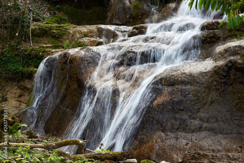 Fototapeta premium Dorfbach mit Wasserfall im Erlenbacher Tobel, verwischtes Wasser, Stufen,...