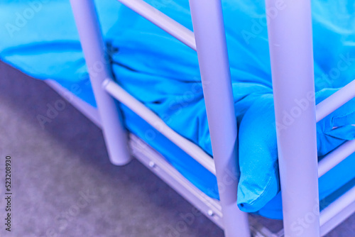 Fototapeta premium Dorm room bunk bed closeup blue sheets