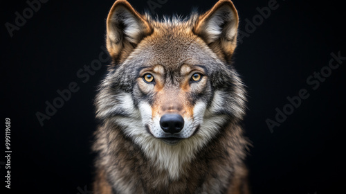 Fototapeta premium Dorosły wilk na czarnym tle, gdzie jego intensywne spojrzenie i mocna postura...